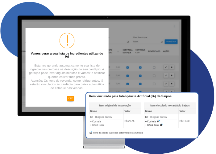 Seja os de revenda ou os da produção na cozinha, a IA vincula os itens e facilita a baixa de estoque no momento da venda